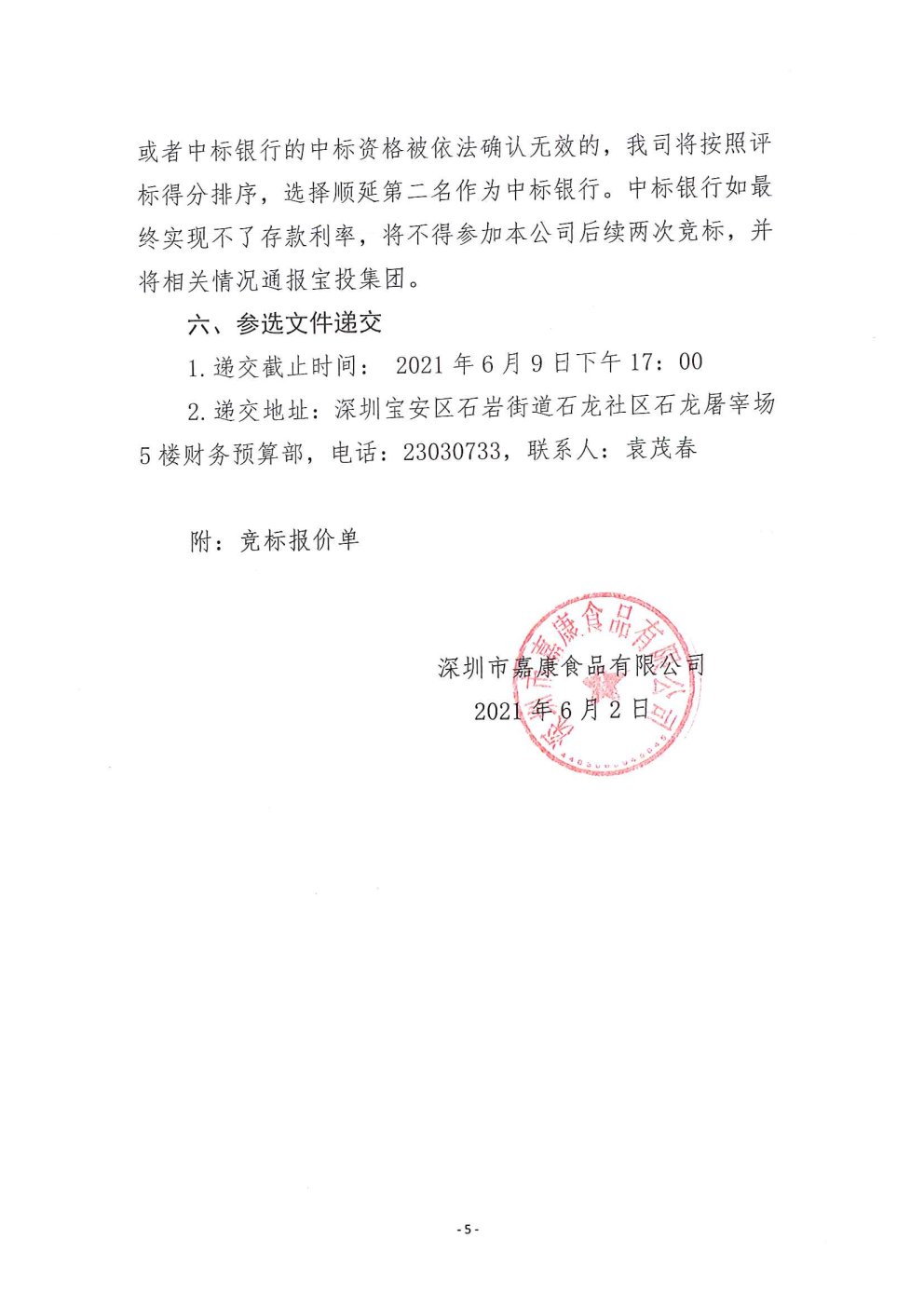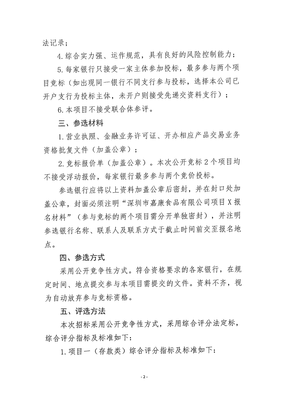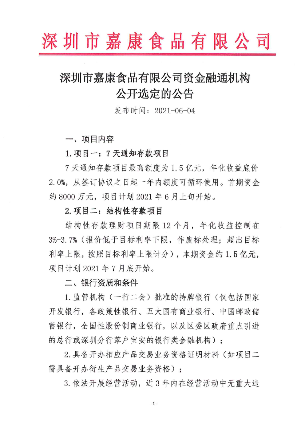 深圳市嘉康食品有限公司资金融通机构公开选定的公告