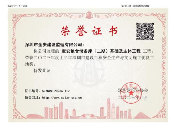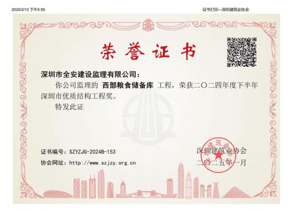 多年来,全安监理公司成功完成了多个标志性市政和房建项目监理,成绩优异。例如,监理的宝安体育馆荣获国家优质工程奖(中国建筑鲁班奖),宝安大道、海纳百川总部大厦、西部粮食储备库等13个项目荣获市级奖项,另有省级荣誉4项、区级荣誉10项。在重大工程项目实践中,全安监理依托专业团队与优质服务,构建起复杂工程监理、国际标准对接、智慧监管实施三大核心能力体系,实现了社会效益与经济效益的双丰收,赢得行业广泛赞誉。近日,在最新公布的全区第一季度建设工程承包商履约评价小型项目中,全安监理公司以优异成绩脱颖而出,成为本季度唯一获评优秀的招标代理单位。